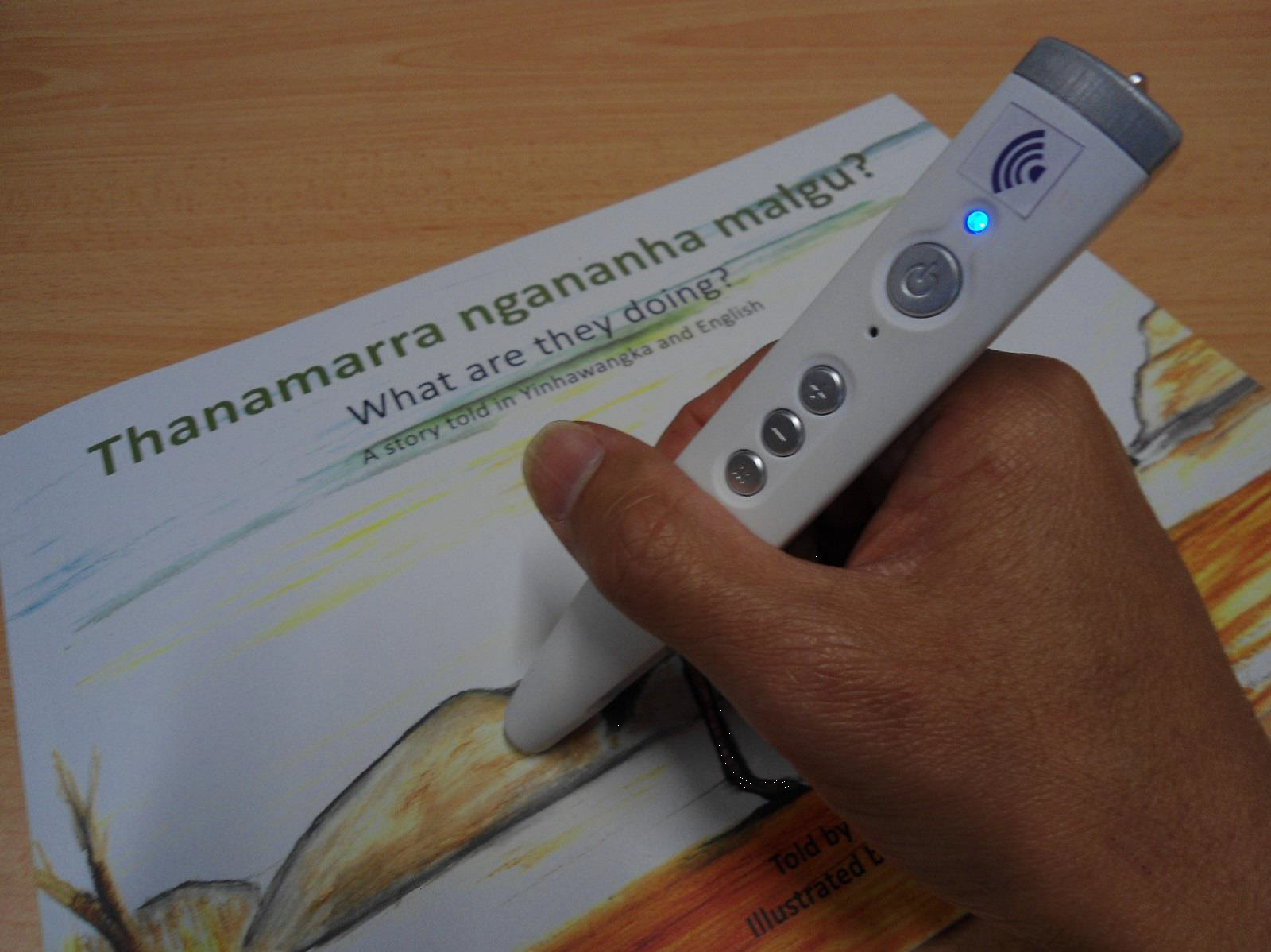 This is the first Wangka Maya publication that uses ‘sound printing’ technology. The audio for the book is marked up by hidden microscopic printing. Each track can be played by moving an audio reader pen across relevant pages or sections. The audio reader pen is a USB audio player with a built-in optical scanner.